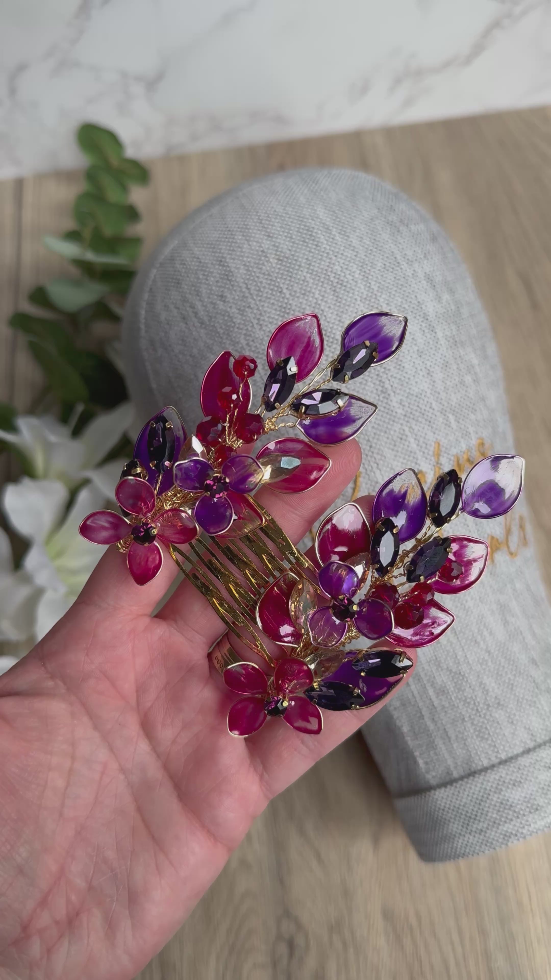 Add some extra flair to your special occasion hairstyle with the Eve Double leaf combs in Burgundy and Purple. These elegant hair clips will keep your hair in place while adding a touch of sophistication and charm. Made with expert craftsmanship and a durable design, these combs are perfect for any event.