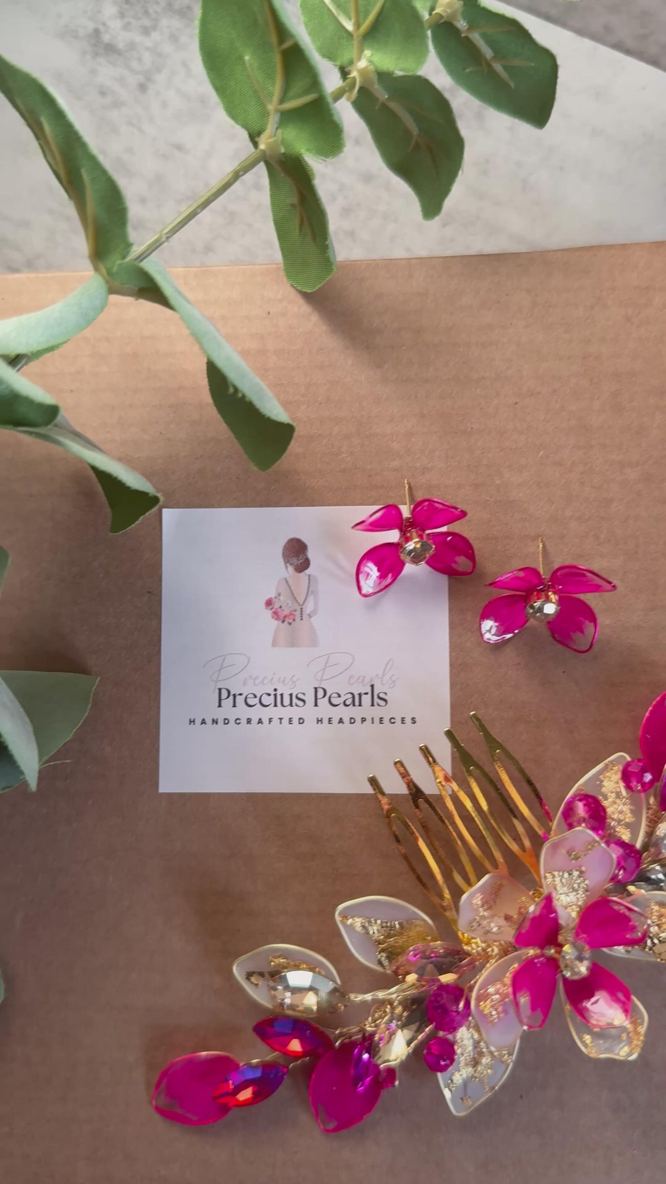 Effortlessly elevate your wedding guest look with our Fuchsia and Frosted Gold Comb. This comb is the perfect accessory for buns and half up do hairstyles, adding a touch of elegance without overwhelming your hair. Whether you prefer a more subtle style or want to keep your hair jewelry minimal, this comb is the perfect choice.