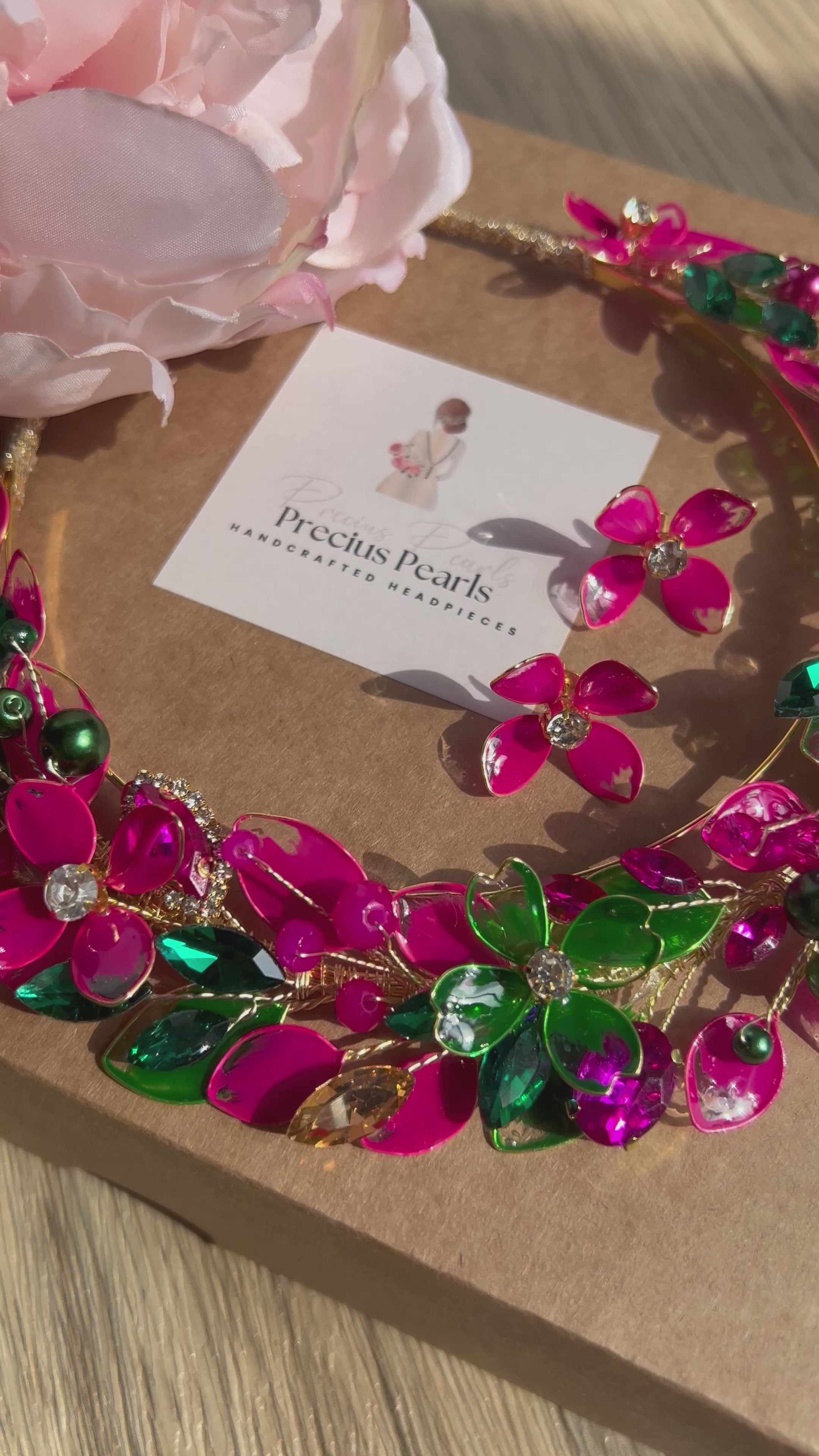 Add a touch of elegance to your wedding guest attire with our Fucshia and Green Halo Wedding Guest Headpiece. This stunning floral and leaf detailed crown features shades of Emerald and Fucshia pink, complementing any ensemble. Complete your look with the included flower earrings.
