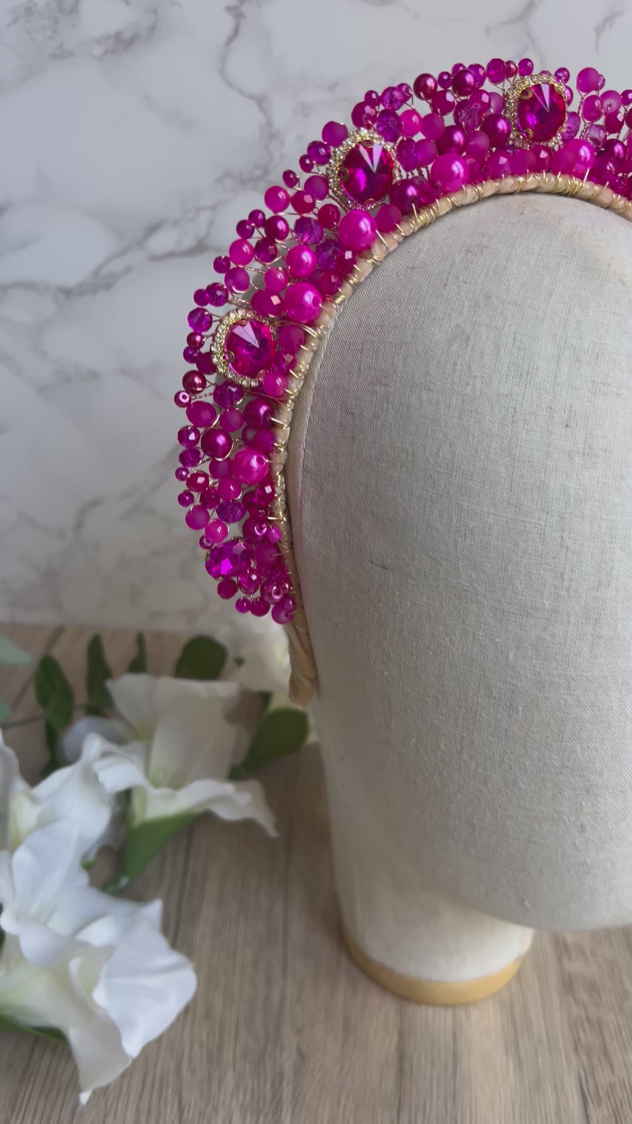 This Fuchsia Crystal Crown is the perfect elegant accessory for your outfit. The stunning and bright rental headpiece is adorned with shimmering crystals that will add a soft touch of glamour to any look. Perfect for special events, this piece will make you feel like a true queen.