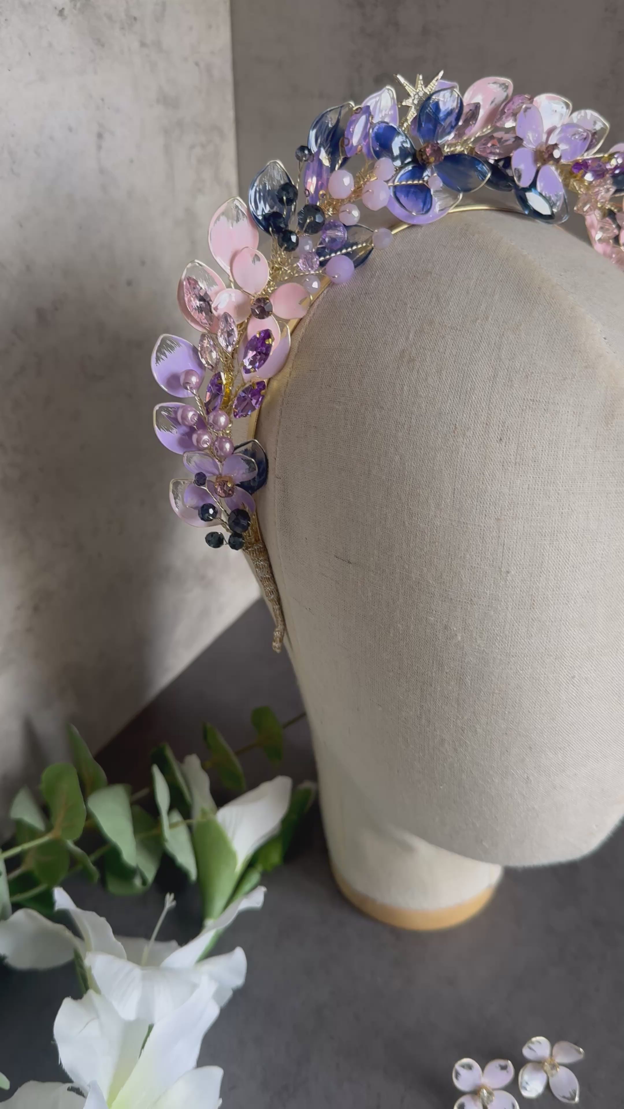 This elegant Florentina crown in shades of lilac, navy, and pink is the perfect accessory for any wedding guest. With its delicate design and beautiful color palette, it will add a touch of sophistication to any outfit. Handcrafted with precision, it is a must-have for any special occasion.