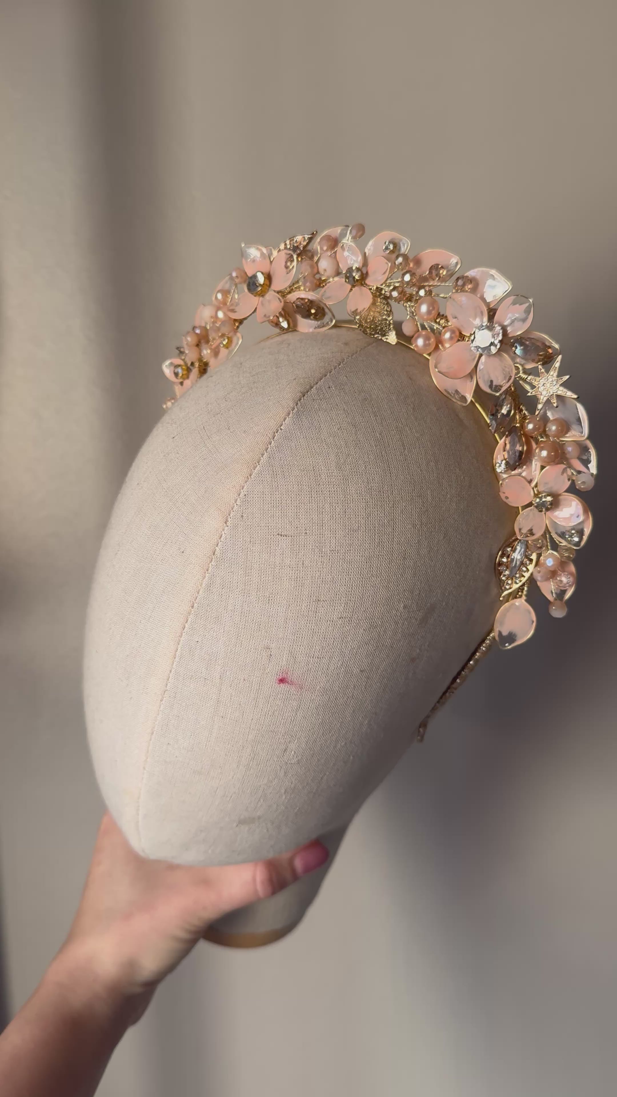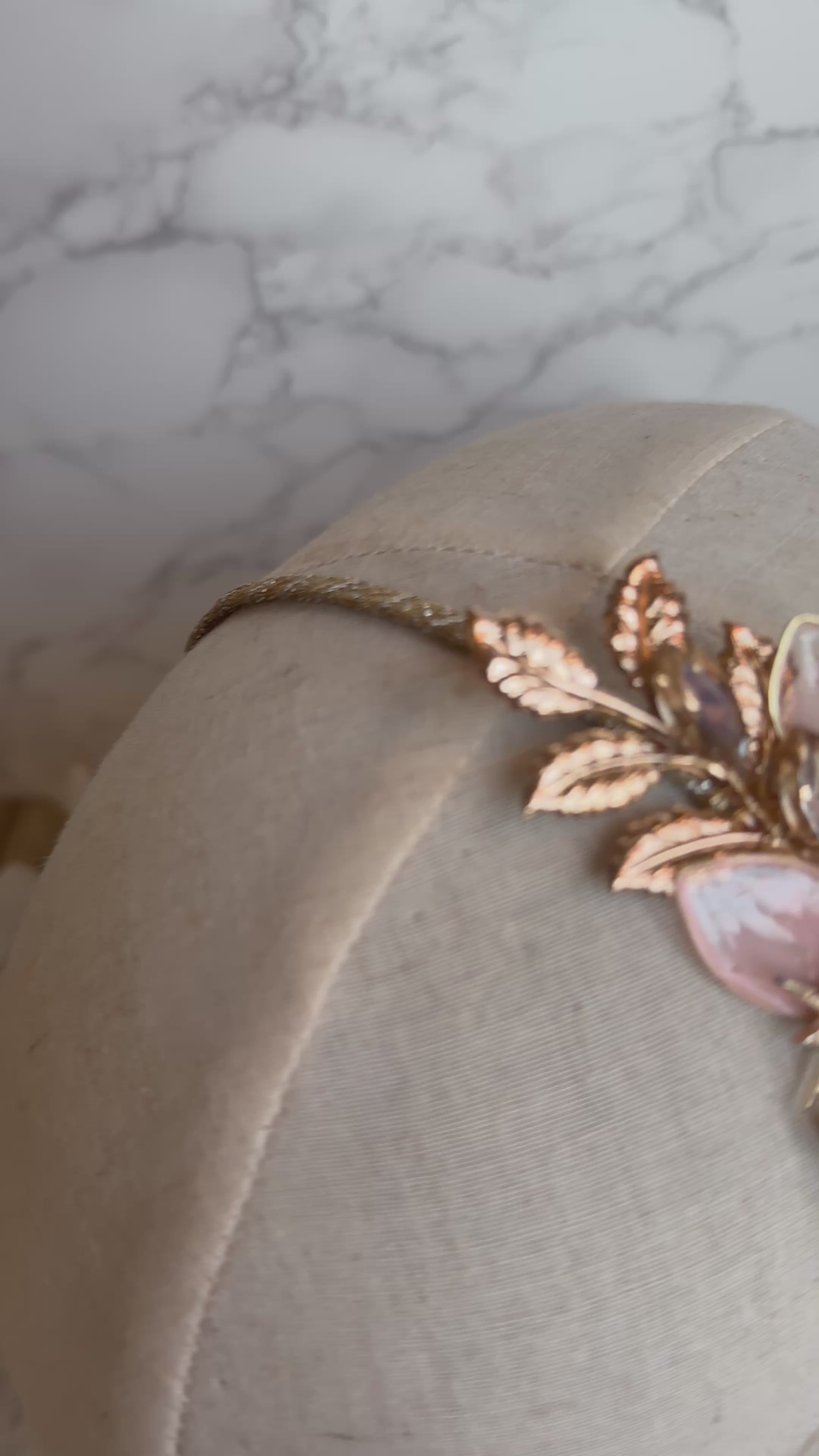 This Pink Beige and Gold headpiece offers versatile styling with two beautiful options - a low side headpiece or high halo. Its subtle hue adds a touch of elegance to any outfit. Elevate your look with this must-have accessory.