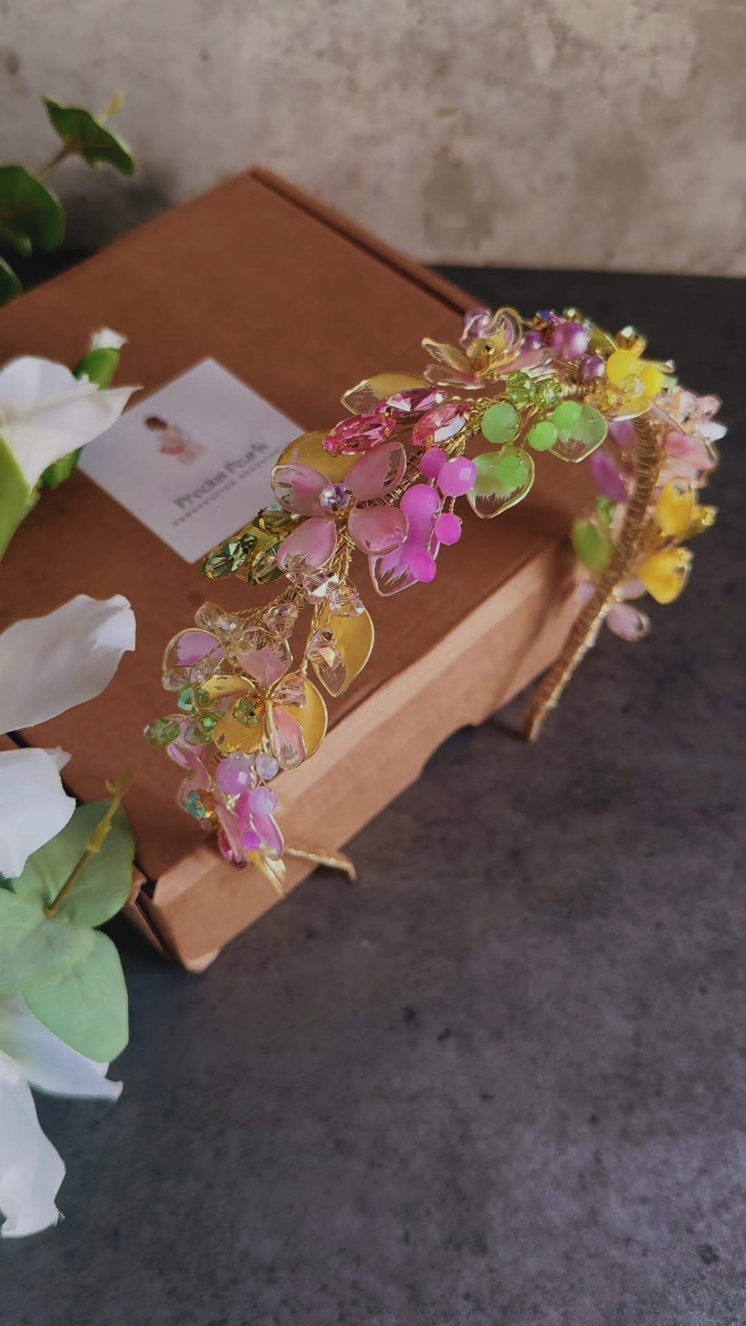 Introducing our SPRING Wedding guest crown, a stunning headpiece featuring beautiful pastel colors. The low and delicate style adds a touch of elegance to any outfit. Stand out from the crowd with this colourful accessory.