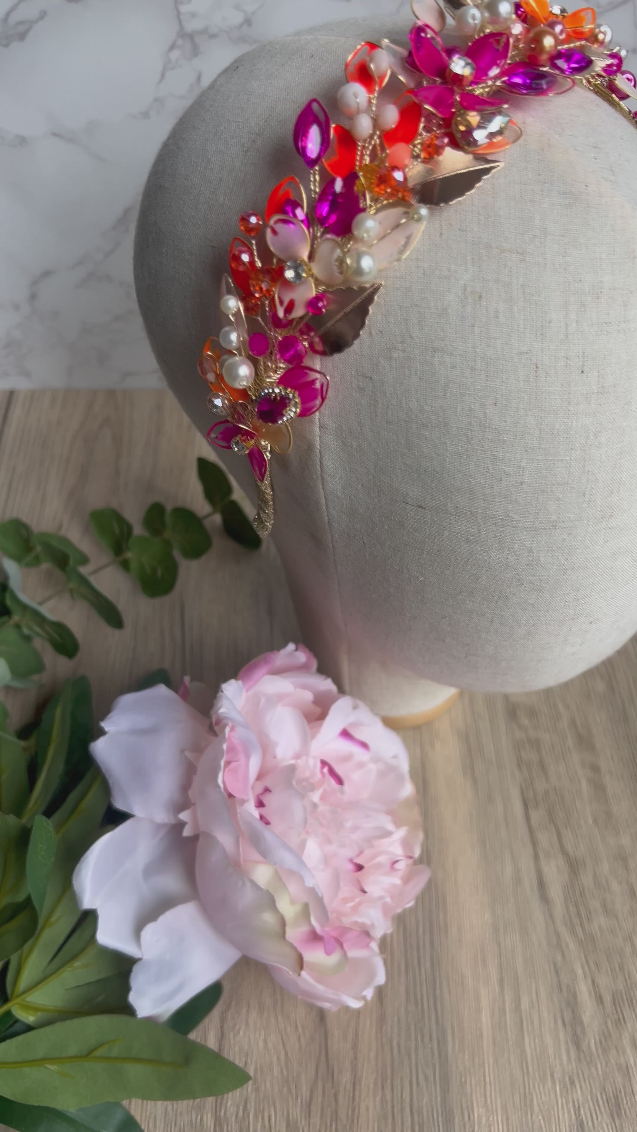 Enhance your wedding guest look with our Stunning Orange and Fucshia low headpiece. This delicate crown features intricate leaf and flower details, adding a touch of elegance to any outfit. Made with high-quality materials for a comfortable and secure fit. Perfect for adding a subtle pop of color to your ensemble.