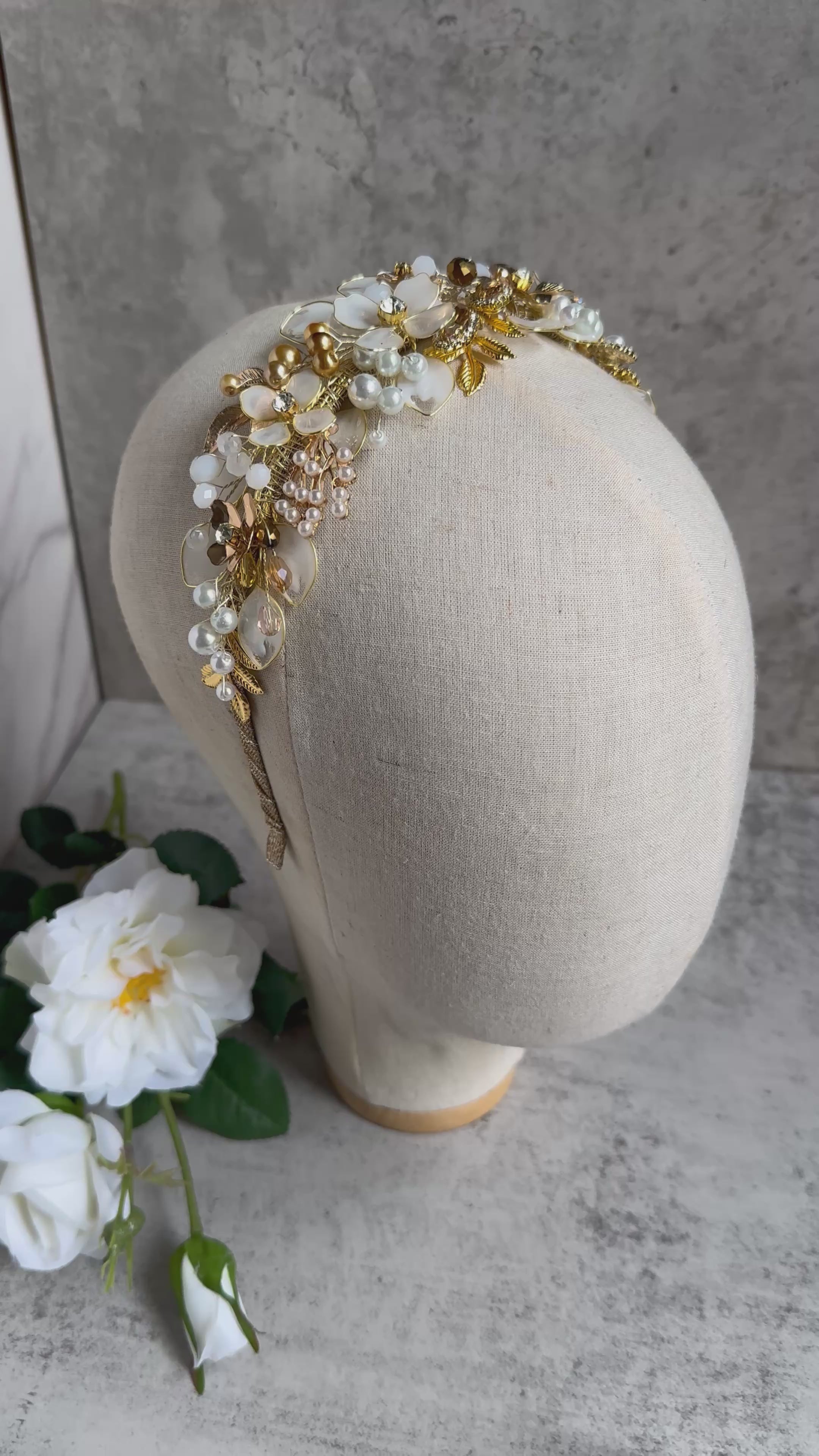 Designed with delicate ivory-toned flowers, lustrous pearls, faceted crystals and gold leaf detailing, each element is individually arranged and wire-wrapped by hand onto a gold-tone base. The result is a beautifully layered crown with depth, texture and a soft glow that catches the light from every angle.